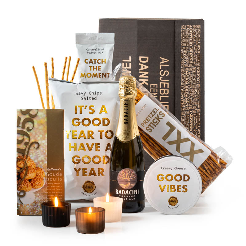 Geniet van een feestelijk borrelmoment met dit kerstpakket vol lekkernijen en warme sfeer. De smaakvolle fles Radacini Sparkling Brut vormt het middelpunt, perfect te combineren met een gevarieerd aanbod van hartige snacks zoals ribbelchips, goudgebakken kaaskoekjes, XXL pretzelsticks, kaaspuntjes en een verrassende pindamix met karamel. De geurige sfeerkaarsjes in glas maken het plaatje compleet. Verpakt in stijl, is dit het perfecte cadeau om samen te proosten.