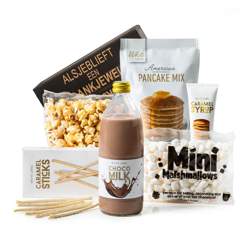 Dit kerstpakket is een echte traktatie voor zoetekauwen en pannenkoek liefhebbers! Een fraai kerstpakket, geheel in wit, en voor ieder wat wils. Het draait helemaal om gezelligheid, comfortfood en genieten van zoete lekkernijen. Heerlijk voor een winterse ochtend of een luie zondag middag.