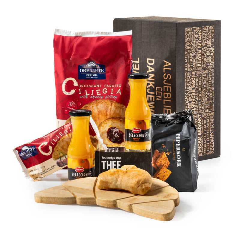 Verras je collega’s of relaties met een stijlvol en smaakvol kerst-ontbijtpakket, een heerlijk begin van de dag. Het pakket bevat een luxe houten serveerplank in een croissantvorm – perfect voor een sfeervol ontbijt. Geniet van twee verfrissende flesjes Juver sinaasappelsap, een pakje bosvruchtenthee, een smeuïge ontbijtkoek en heerlijke, met kersenjam gevulde croissants van Ore Liete. Alles wordt verpakt in een fraaie geschenkdoos.