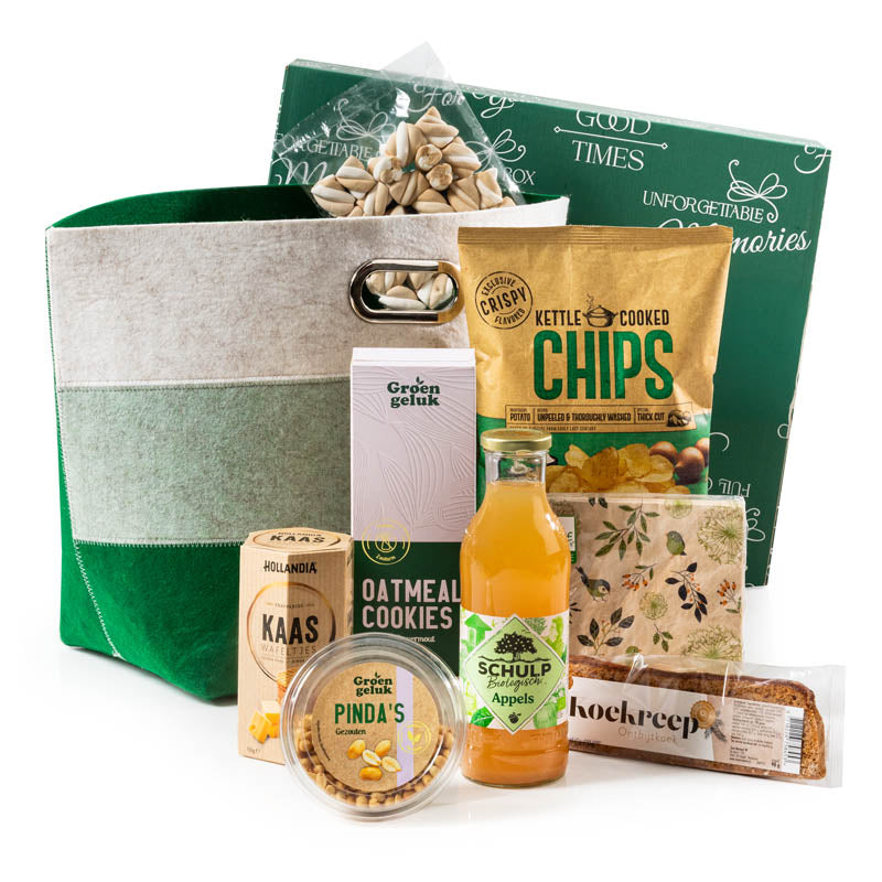 Dit mooie, gedeeltelijk biologisch getinte kerstpakket heeft een natuurlijke, rustige uitstraling en straalt duurzaamheid en comfort uit. Een stijlvol, rustgevend kerstpakket boordevol natuurlijke producten en verpakt samen met een duurzame groen getinte vilten tas. Perfect voor wie houdt van pure smaken en bewuste keuzes.