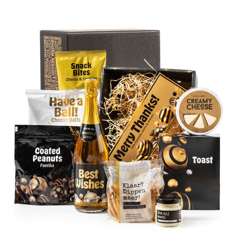 Chic, stijlvol en boordevol lekkers – dit is hét kerstpakket voor iedereen die houdt van een tikkie luxe met een knipoog. Te beginnen met een fles 0.0% bubbels met daarbij diverse hartige snacks. Maar ook aan de liefhebber van zoetigheden is gedacht; een XXL chocolade reep, om je vingers bij af te likken! Perfect voor de fijnproever, borrelfan én feestganger in één.