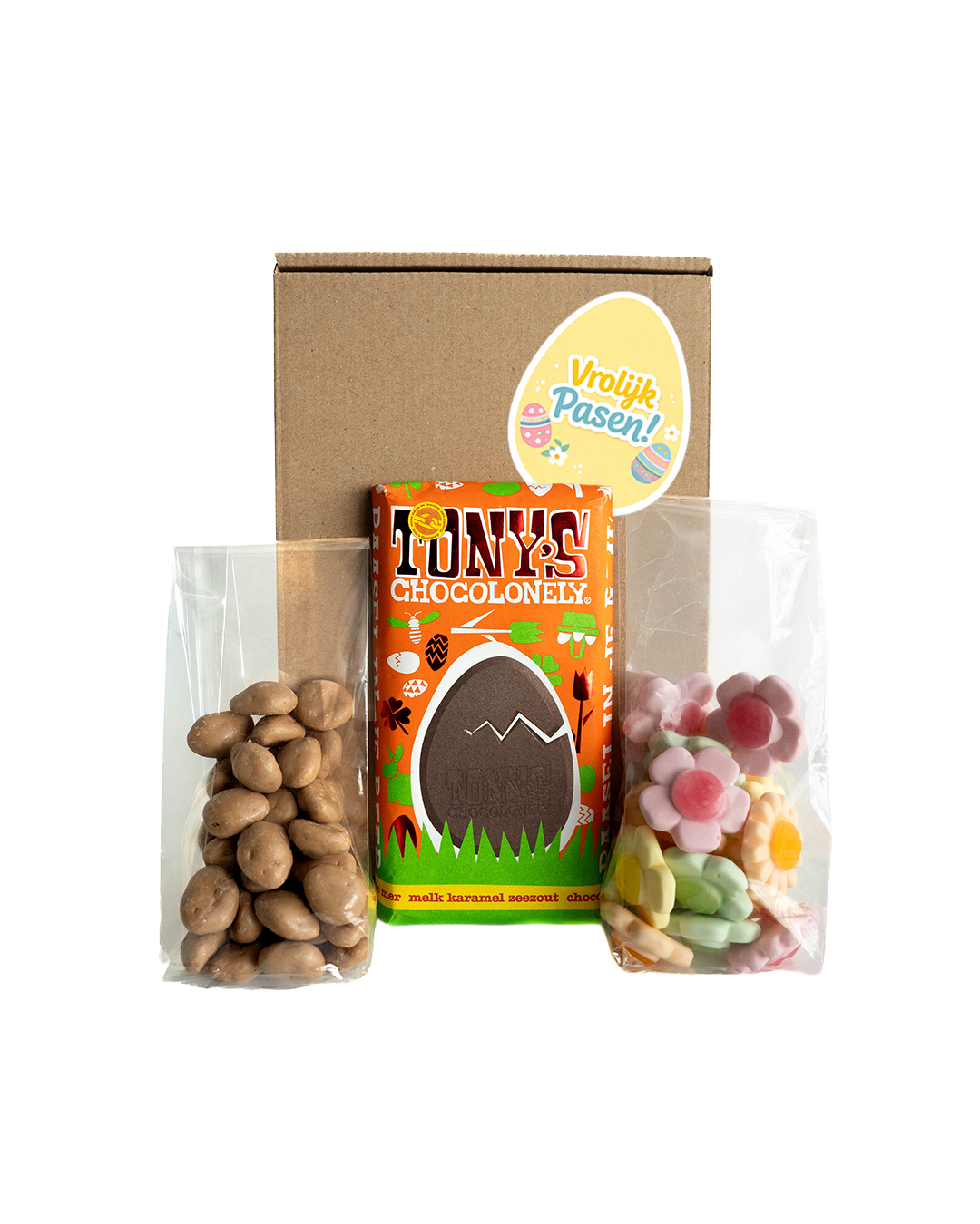 Een luxe brievenbus paaspakket met verrassingen! In dit pakket vind je een Tony’s melk karamel zeezout reep, Van Delft paaseitjes crunch karamel zeezout en vrolijke bloemensnoepjes, een feestelijke combinatie voor een echte verwenner. Perfect om collega’s of klanten op een originele manier te verrassen.