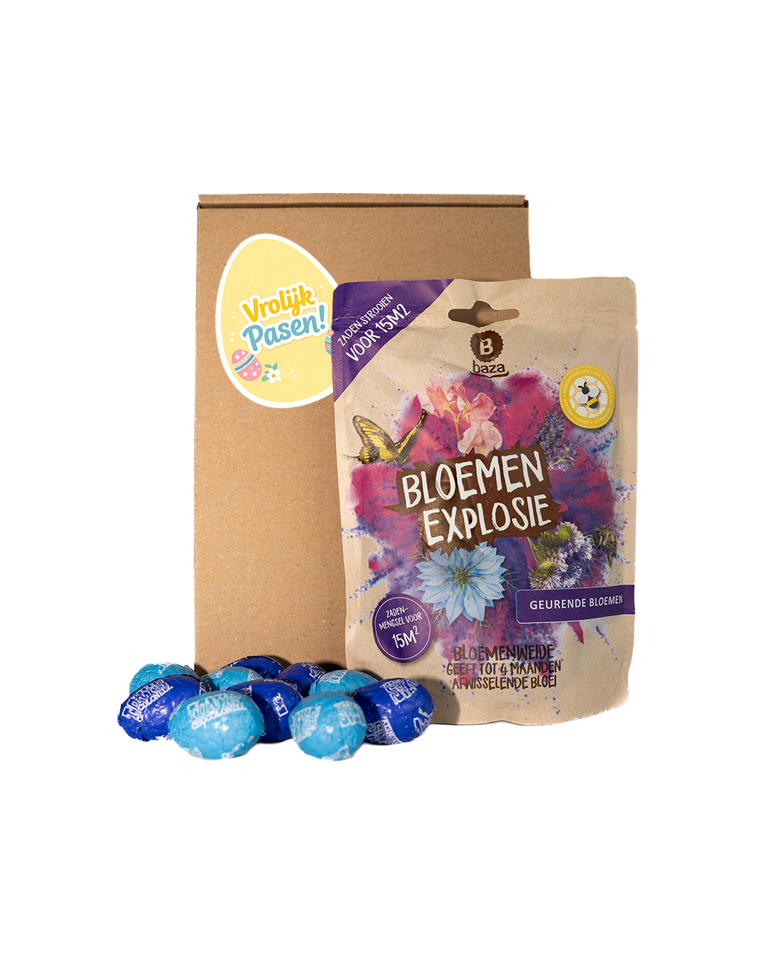 Een stijlvol brievenbus paaspakket met geur en chocolade! In dit pakket zitten 5 Tony’s donkere melk eitjes, 5 Tony’s puur eitjes en een Bloemen explosie geurende bloemenmix, een feestelijke combinatie voor een luxe paasverrassing. Perfect om collega’s of relaties op een originele manier te verrassen.