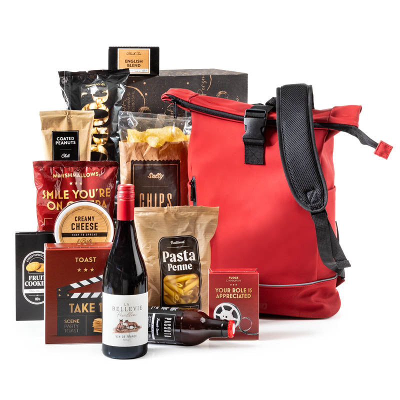 Met de robuuste rugtas als blikvanger is dit een kerstpakket waar iedereen blij van wordt. Het bevat, naast de handzame roltop rugtas, diverse lekkernijen zoals een Franse rode wijn en hartige gezouten chips. Voor een gezellig avondje met familie of vrienden.