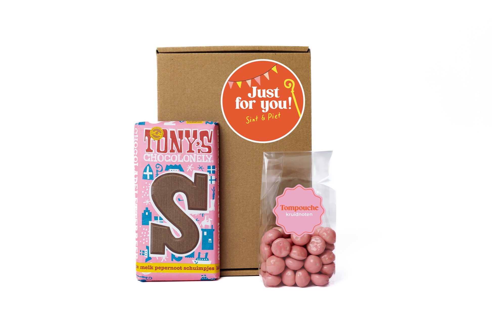 Sinterklaas, maar dan in het roze! Dit opvallende brievenbuspakket bevat Van Delft tompouce-kruidnoten én de roze Tony’s melkreep met pepernoot en schuimpjes. Een vrolijke en verrassende combinatie die meteen in het oog springt. Perfect om collega’s of relaties feestelijk én origineel te verrassen. Voeg een kaartje toe voor een persoonlijke touch – en je zit gegarandeerd goed.