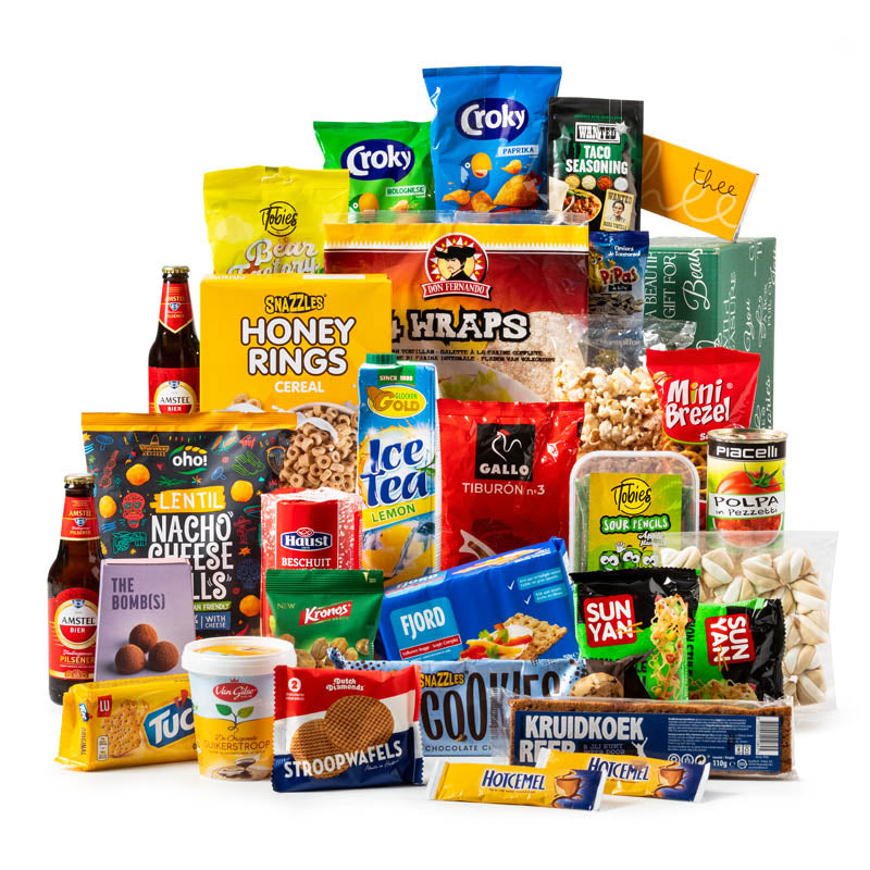 Een kerstpakket, kleurrijk, boordevol zoete, zoute én internationale lekkernijen. Dit is duidelijk een funpakket dat mikt op een breed publiek en gegarandeerd een glimlach bezorgt. Het is een feest voor elke liefhebber van variatie en comfort food. Van Aziatische noedels tot Amstel bier, Hollandse stroopwafels, ice tea, snoep, chocomelk en nog veel meer. Perfect als familiepakket, teamcadeau of studentenpakket.