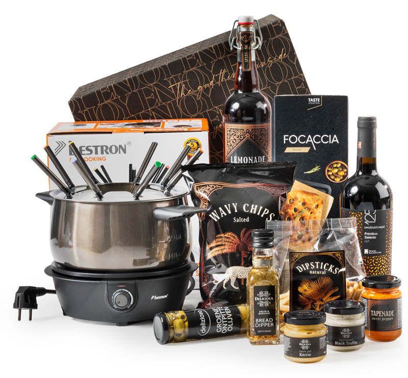 Stijlvol tafelen en samen genieten? Dat gaat lukken met dit prachtige kerstpakket. Het bevat alles voor een avond lang gezellig fonduen. De titaan kleurige elektrische fonduepan van Bestron zorgt voor gebruiksgemak en sfeer. Dit feestje maken we compleet met verfijnde dips, focaccia, brooddipper en een uitstekende fles Italiaanse rode wijn. Een stijlvol en compleet eindejaar cadeau voor de echte fijnproever, en dat zie je!