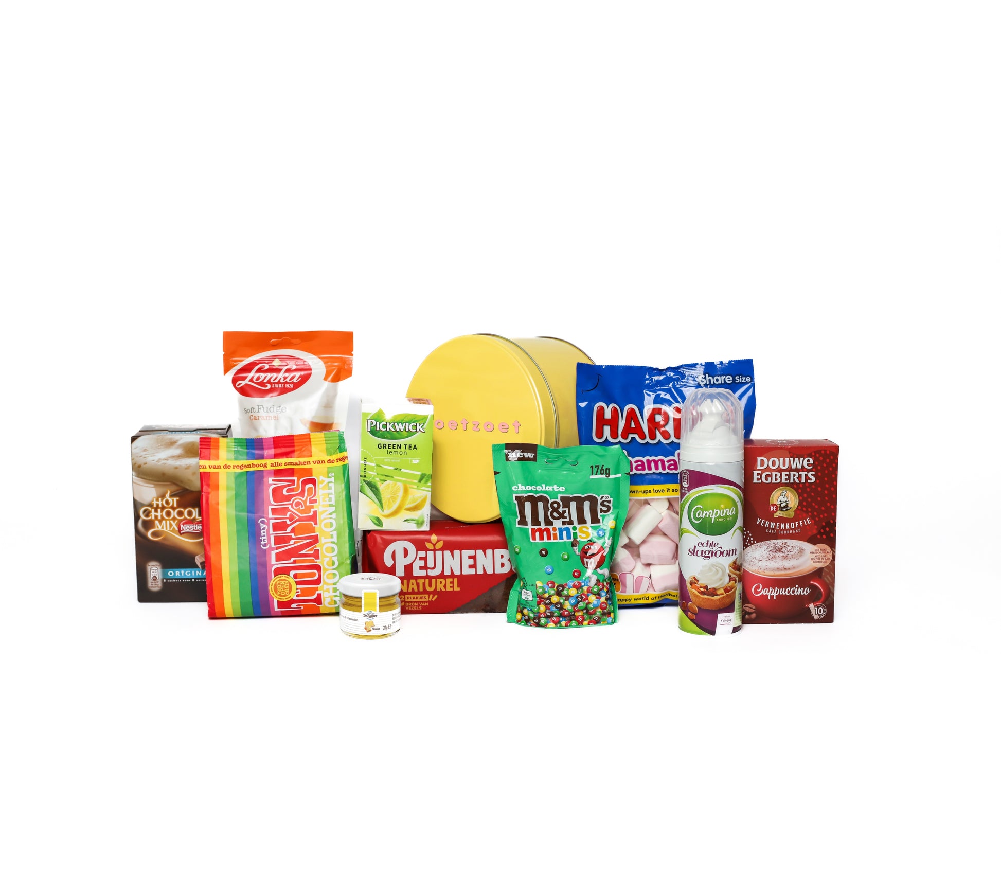 Maak een koude avond extra gezellig met dit pakket vol zoete en warme traktaties. Een vrolijke koektrommel, warme chocolademelk en marshmallows zorgen voor een moment vol knusheid en genieten.