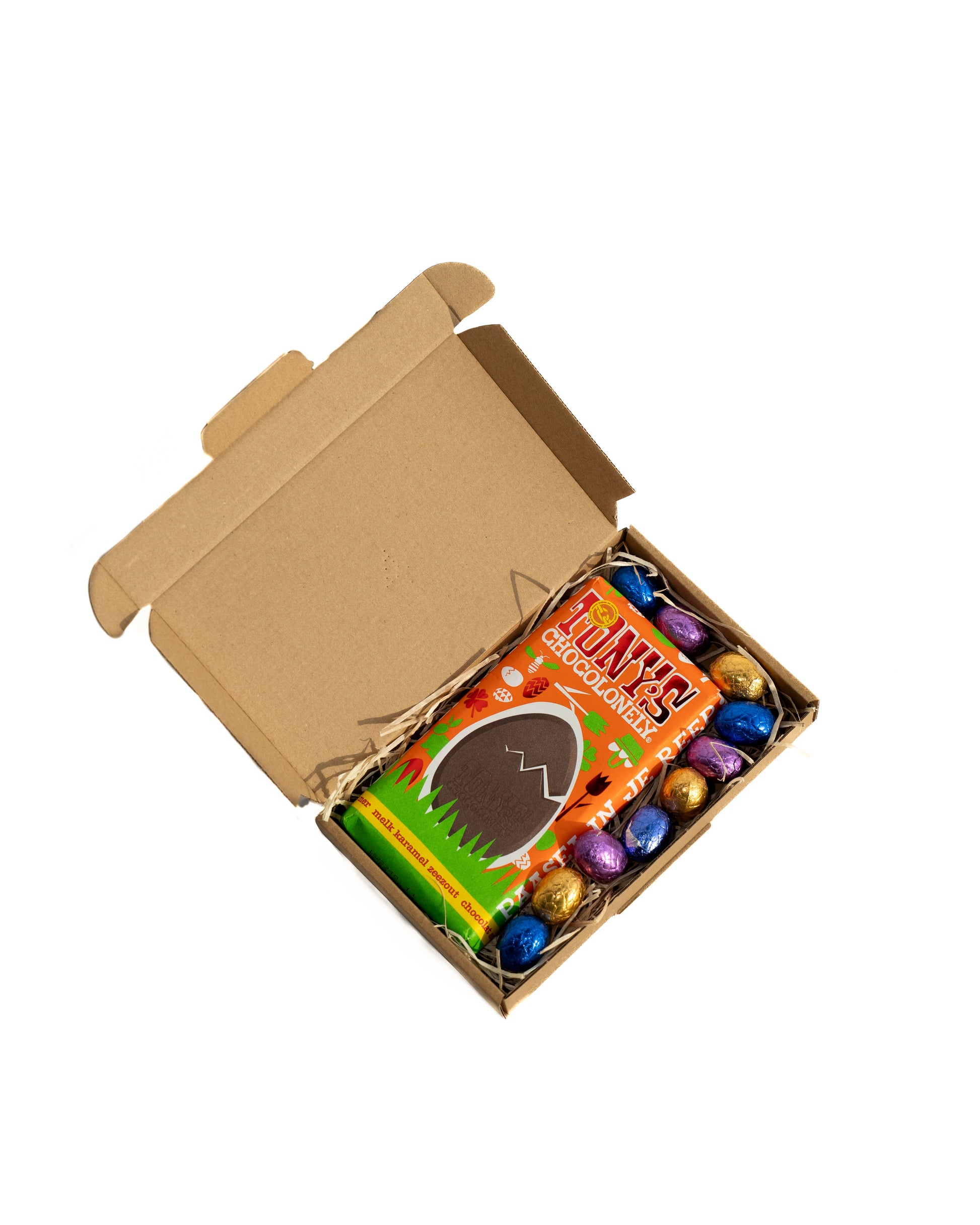 Een klassiek brievenbus paaspakket voor zoetekauwen! Dit pakket bevat een Tony’s melk karamel zeezout reep en 10 paaseitjes, een rijke combinatie van zoet en feestelijk. Perfect om collega’s, klanten of vrienden op een originele manier te verrassen.