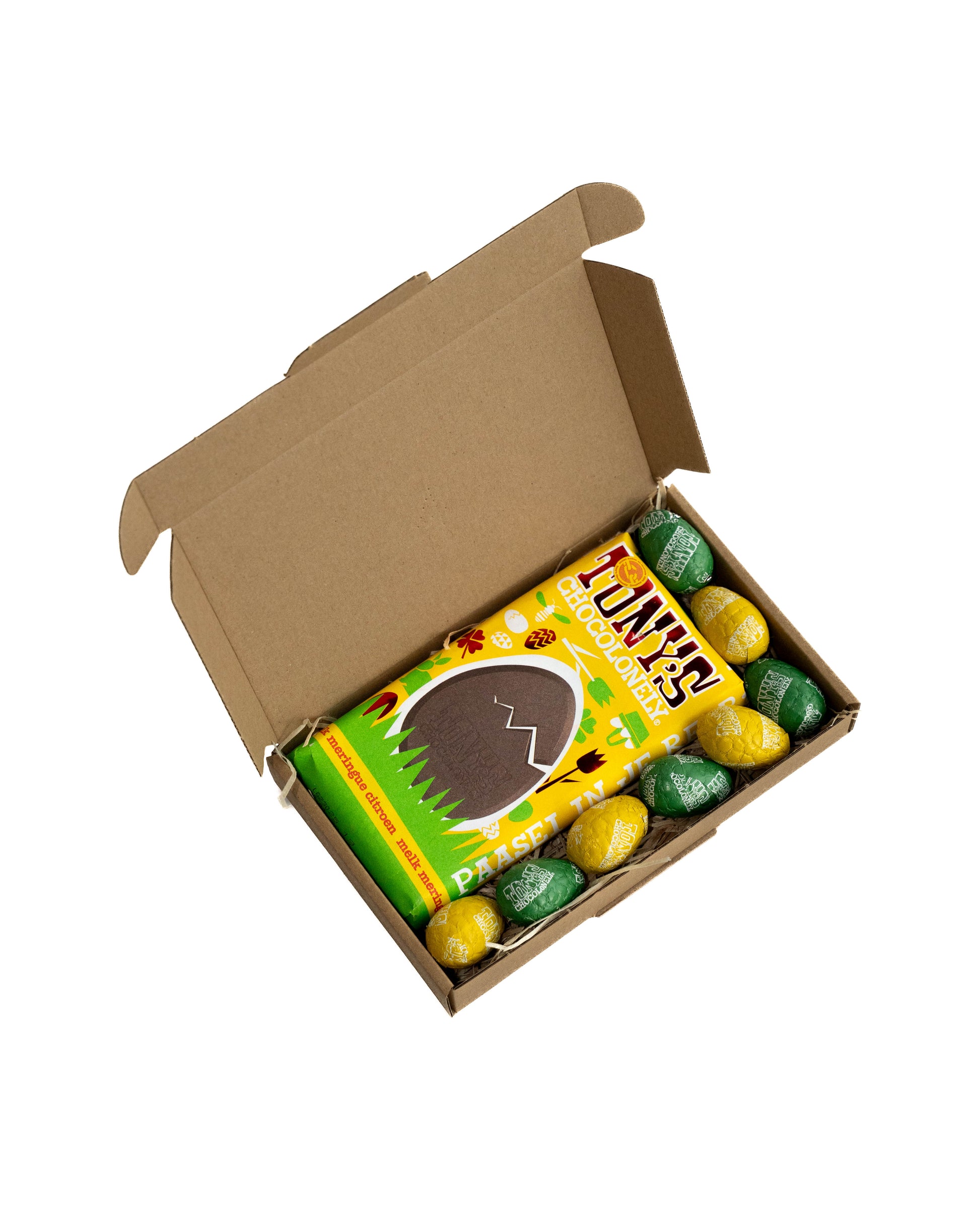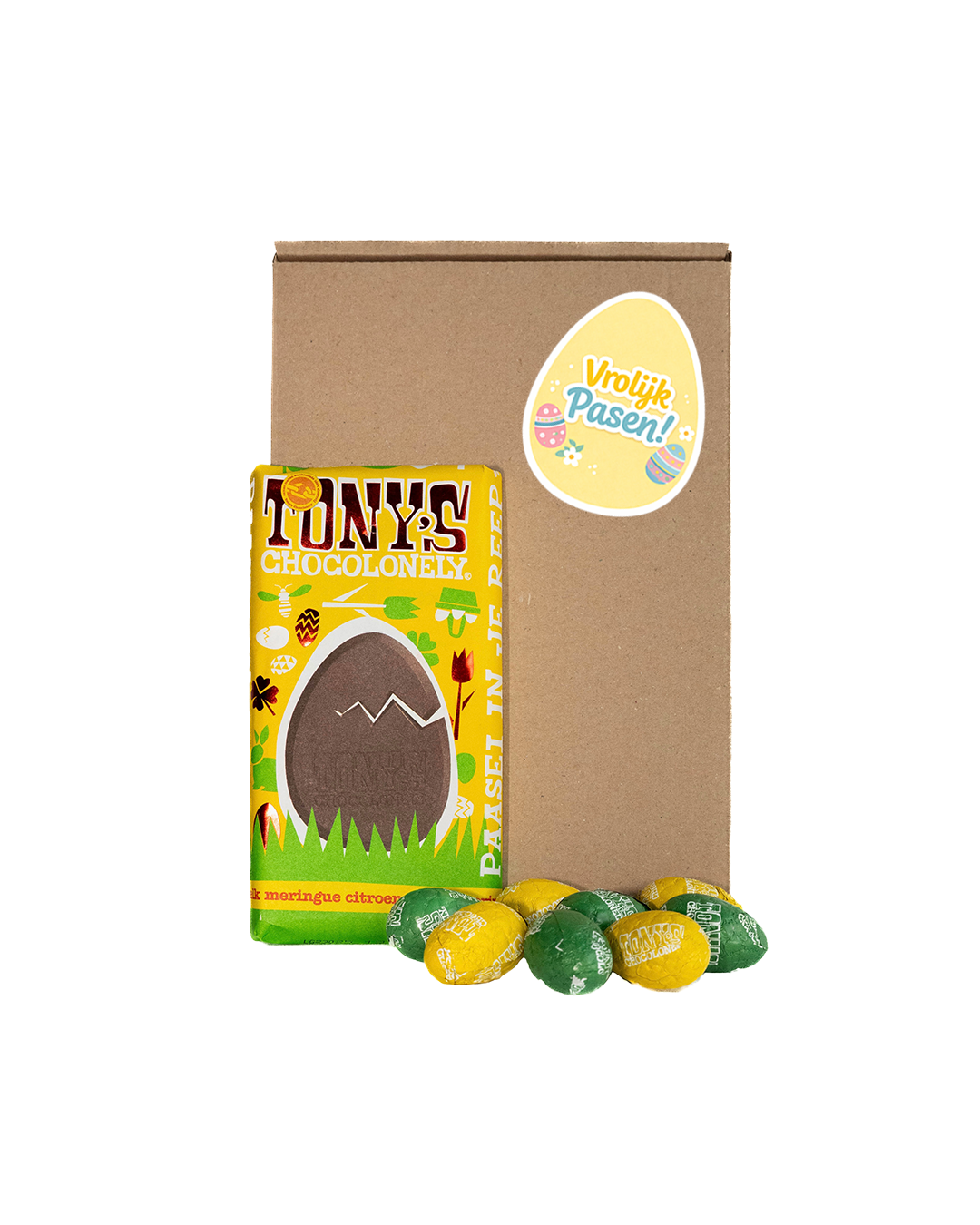 Een brievenbus paaspakket vol vrolijkheid! Dit pakket bevat een Tony’s melk lemon meringue reep en een mix van 4 Tony’s melk nougat eitjes en 4 Tony’s melk hazelnoot eitjes, een speelse combinatie voor de echte chocoladefan. Perfect om collega’s of relaties op een originele manier te verrassen.