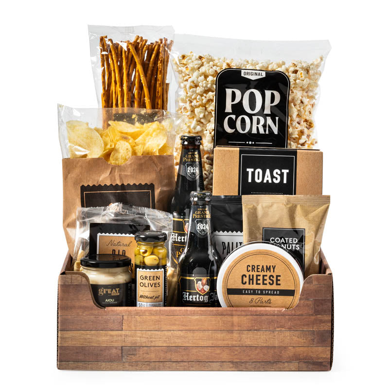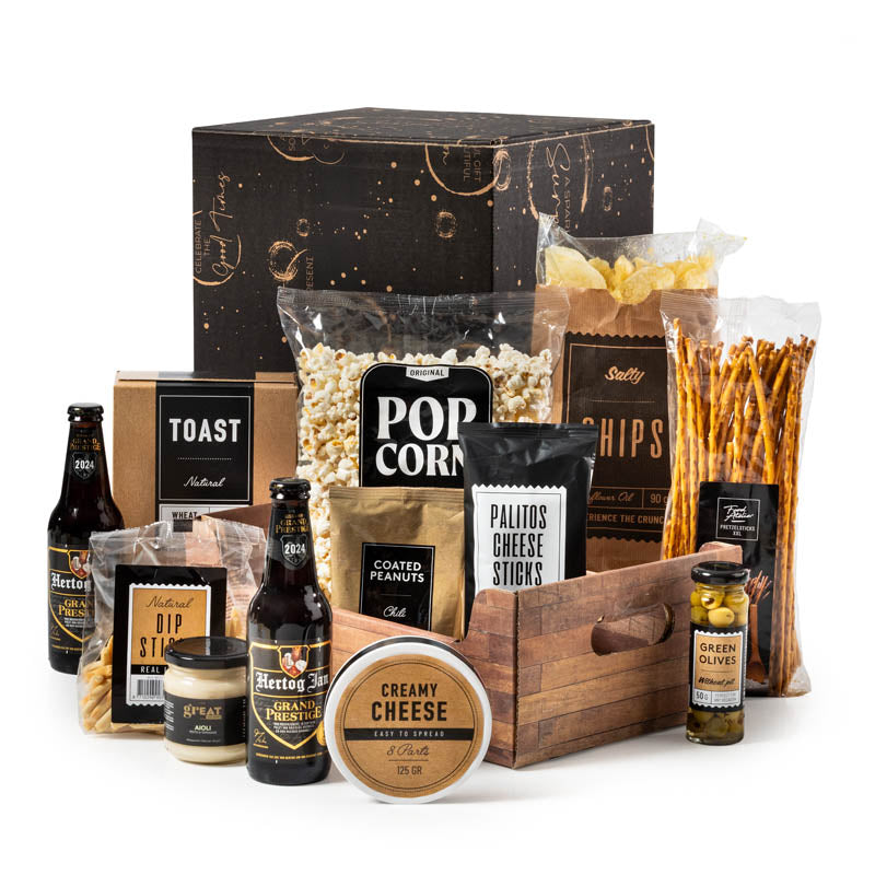 De lekkerste borrelbox voor iemand die het verdient! Met deze robuuste borrelbox geef je een kerstpakket dat zeker in de smaak zal vallen. Een goed gevuld en stoer kerstpakket met hartige lekkernijen, Hertog Jan Grand Prestige en luxe snacks – perfect voor een fijne borrelavond met vrienden of familie.