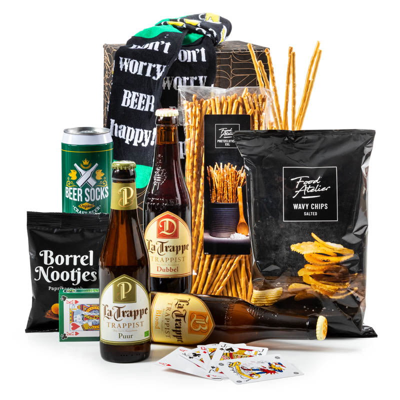 Dit is hèt ultieme pakket voor de liefhebber van bier, borrel en gezelligheid! Met een knipoog: Grappige biersokken verpakt in een bier/spaarpot blik. Comfortabel én origineel. Daarbij diverse krokante klassiekers die perfect matchen met een koud biertje.