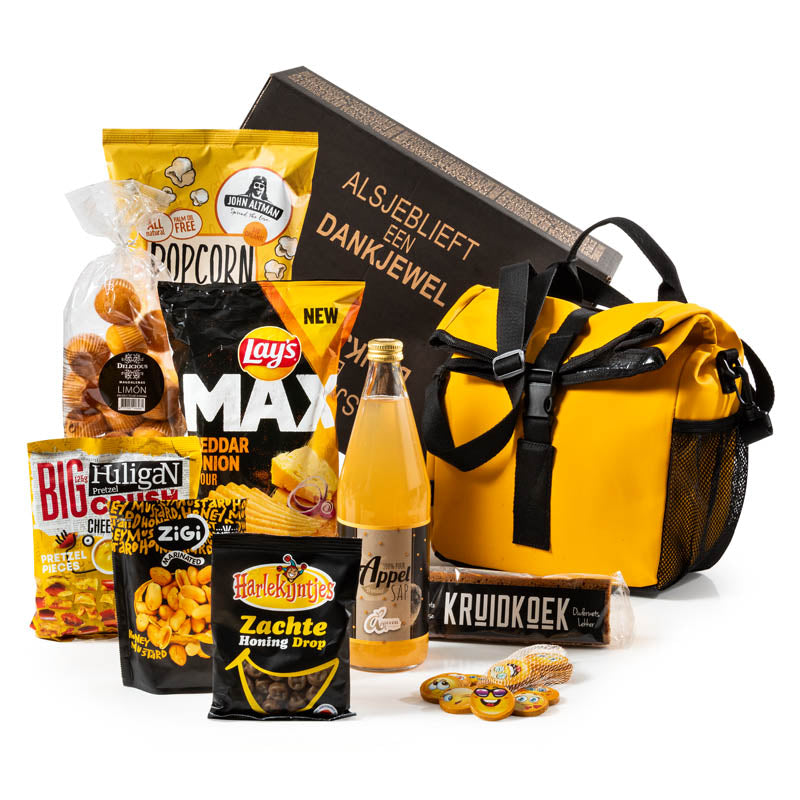 Dit trendy kerstpakket combineert comfort, smaak én functionaliteit. De opvallende gele fiets/koeltas is samen verpakt met zoete en hartige lekkernijen. Deze koeltas is ideaal voor onderweg, op of naar het werk en voor de gekoelde boodschappen.